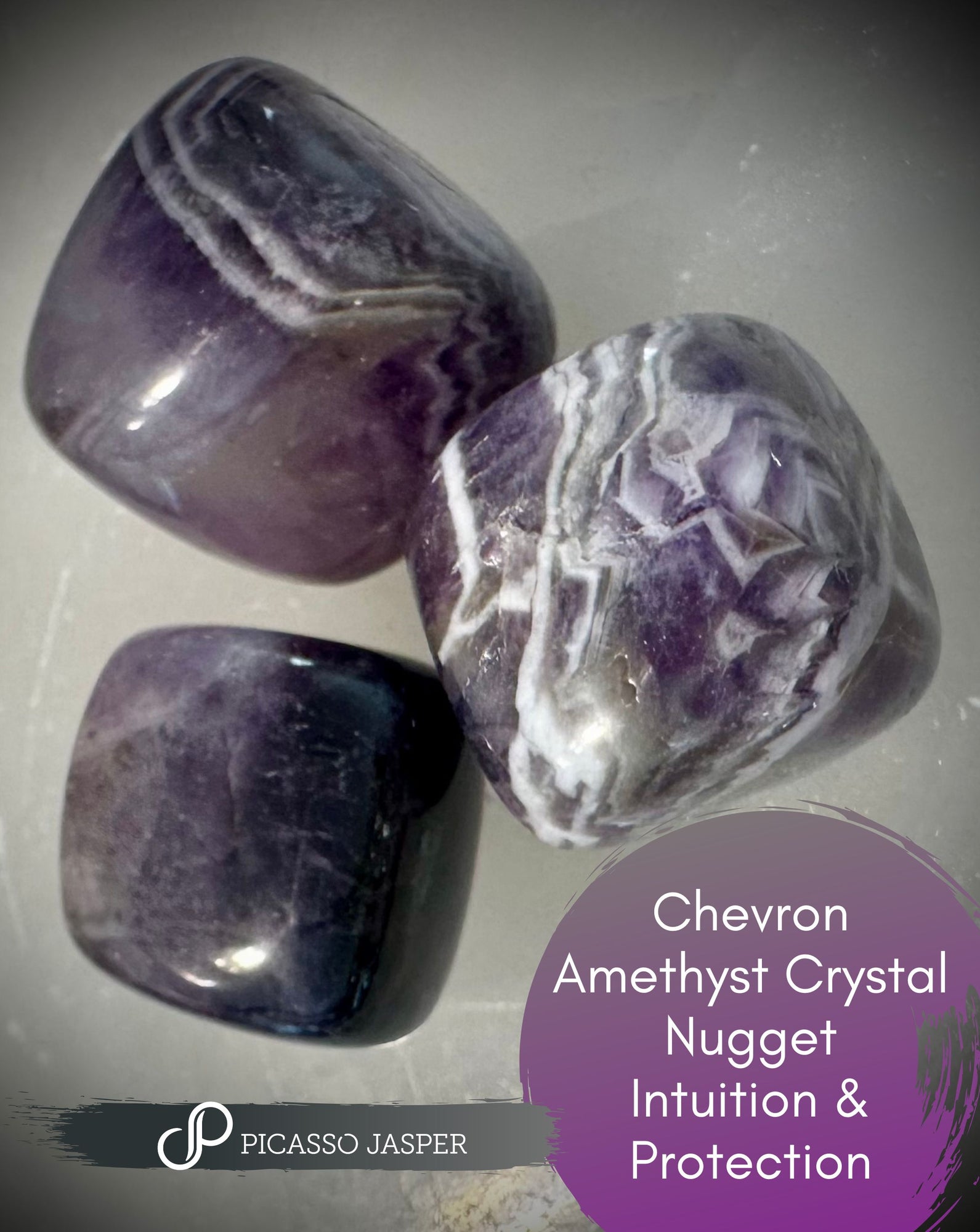 These beauties are gorgeous! You can feel the magic! Chevron Amethyst has a bit of white quartz running through- the pattern tells a story! Love the nugget shape for these! I like to keep Amethyst by my front door or bedside- a sort of 'shield' to prevent unwanted energy from entering my home or dreams while asleep.