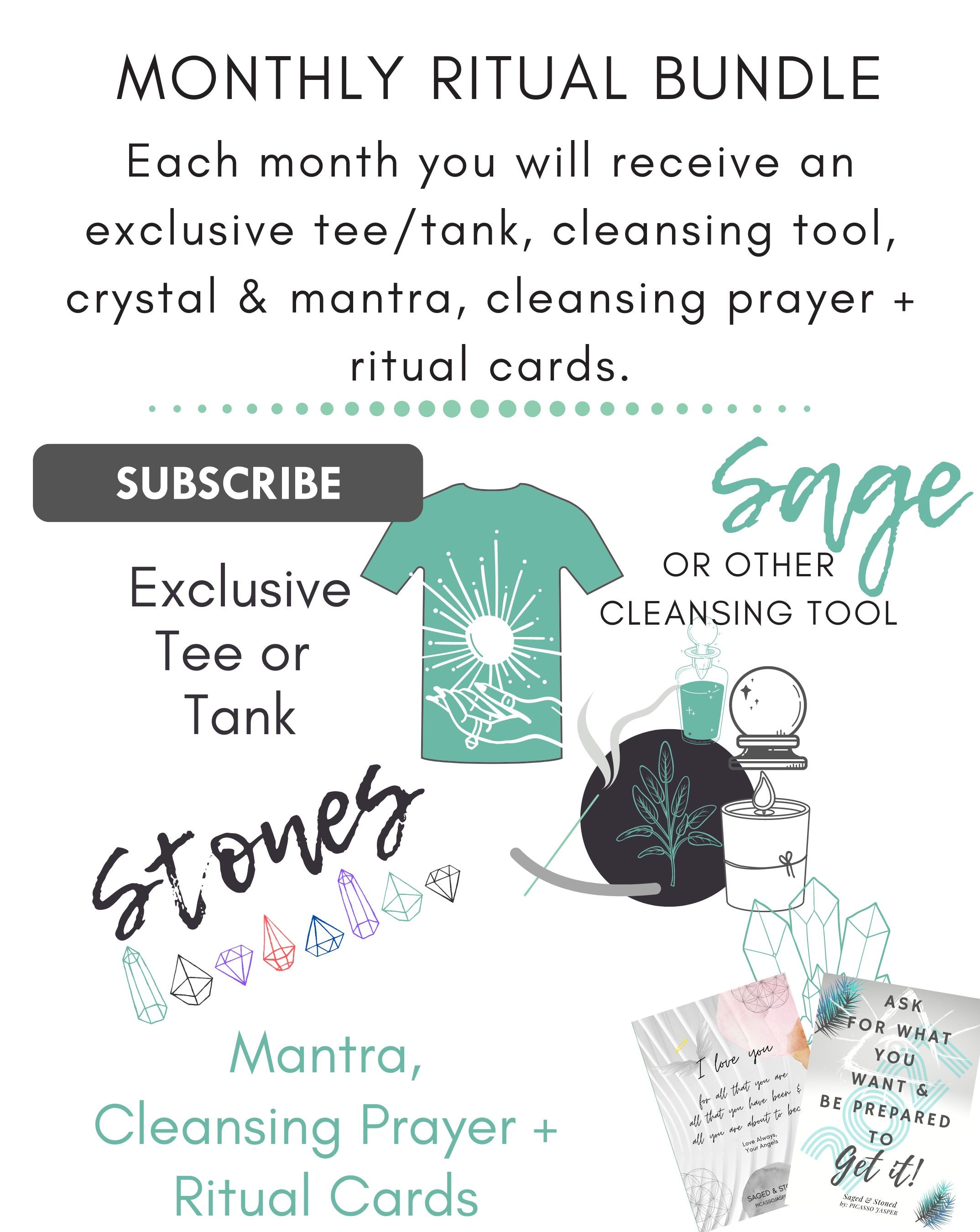 SAGED & STONED is our monthly subscription for the mystically minded! Join our Tee/tank or Ritual Bundle of the month!