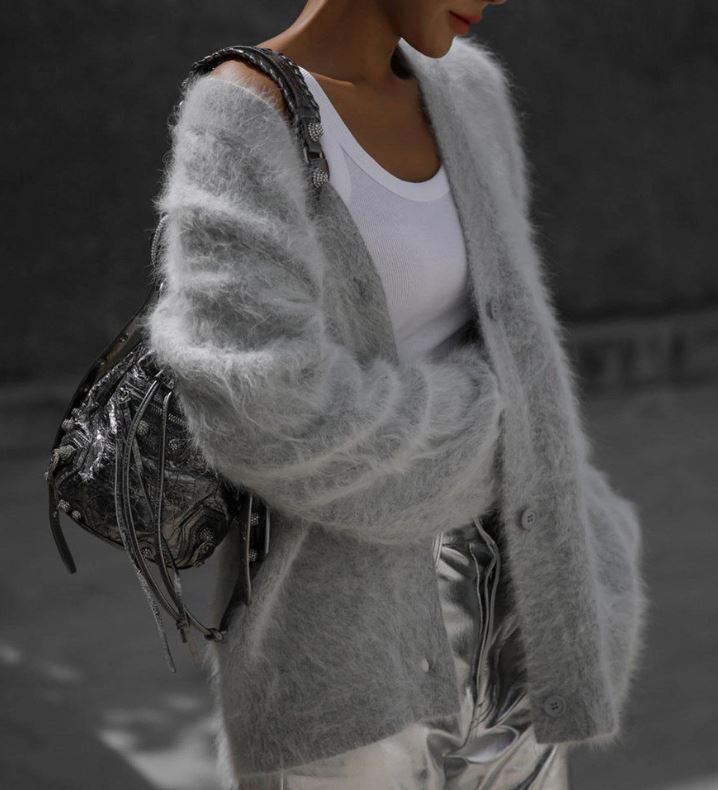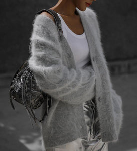 LAST TWO! Wrap yourself in pure comfort with this irresistibly cozy cardigan! Crafted from soft faux mink yarn, it's the ultimate layering piece that keeps you warm without the bulk. The relaxed, oversized fit with drop shoulders flatters every figure, while the deep V-neckline & button-front closure add style. Love the cozy texture of the light gray- perfect for layering over t's & tanks.