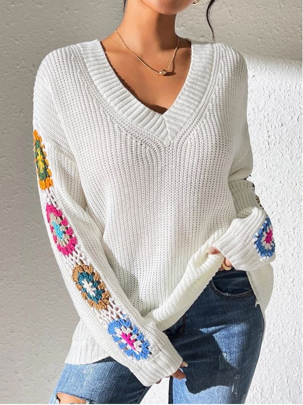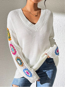 *Last one! Embrace your Goddess in our Crochet Cream Sweater! Delicate crochet floral designs dance down the sleeves, adding whimsical color and texture to your look. Love the flattering V-neck and soft, cozy, breathable fabric that feels as good as it looks- this sweater delivers warmth without the weight. Love this with jeans or tucked in with our Magic Pants!