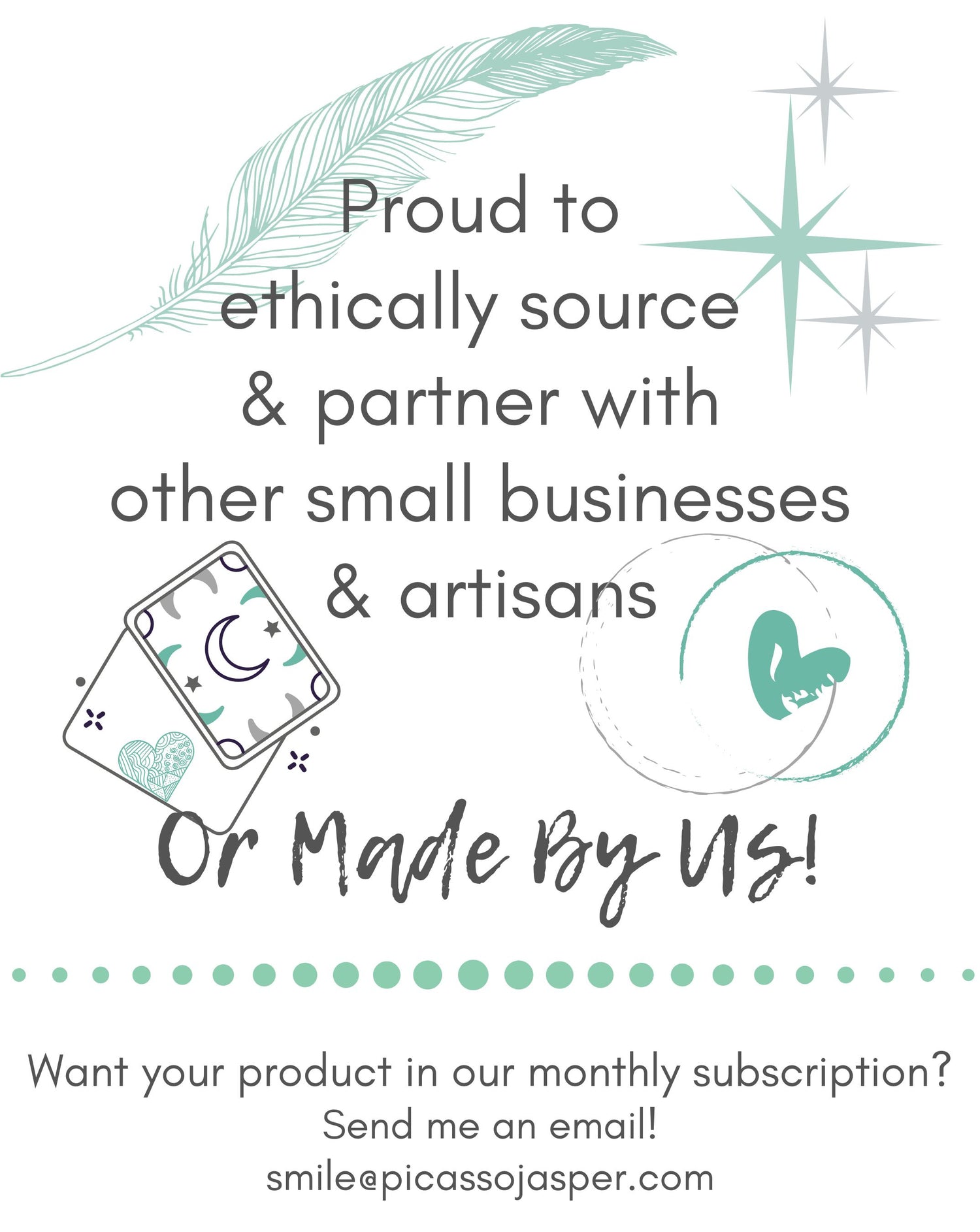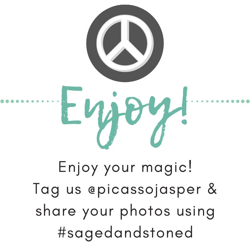 Please Note: If you receive our ritual bundle subscription, you will not receive SAGE every. single. month. That's a lot of SAGE! We mix it up with different "cleansing tools". We hope this introduces you to new ways to cleanse your mind, body & soul. Our items are made by us, carefully curated using local artisans, Etsy artisans and even our own subscribers! It is important to us to support other small businesses. Always ready to partner with like minded souls! If you would like your product to be considered, send me an email! smile@picassojasper.com